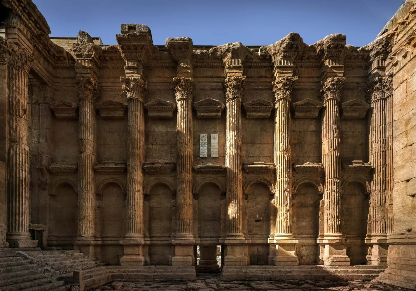 The Temple of Bacchus is part of the Baalbek archaeological site, in Beqaa Valley region of Lebanon. The temple complex is considered an outstanding archaeological and artistic site of Imperial Roman Architecture and was inscribed as a UNESCO World Heritage Site in 1984. This monument to Bacchus is one of the best preserved and grandest Roman temple ruins; its age is unknown, but its fine ornamentation can be dated to the second century CE.