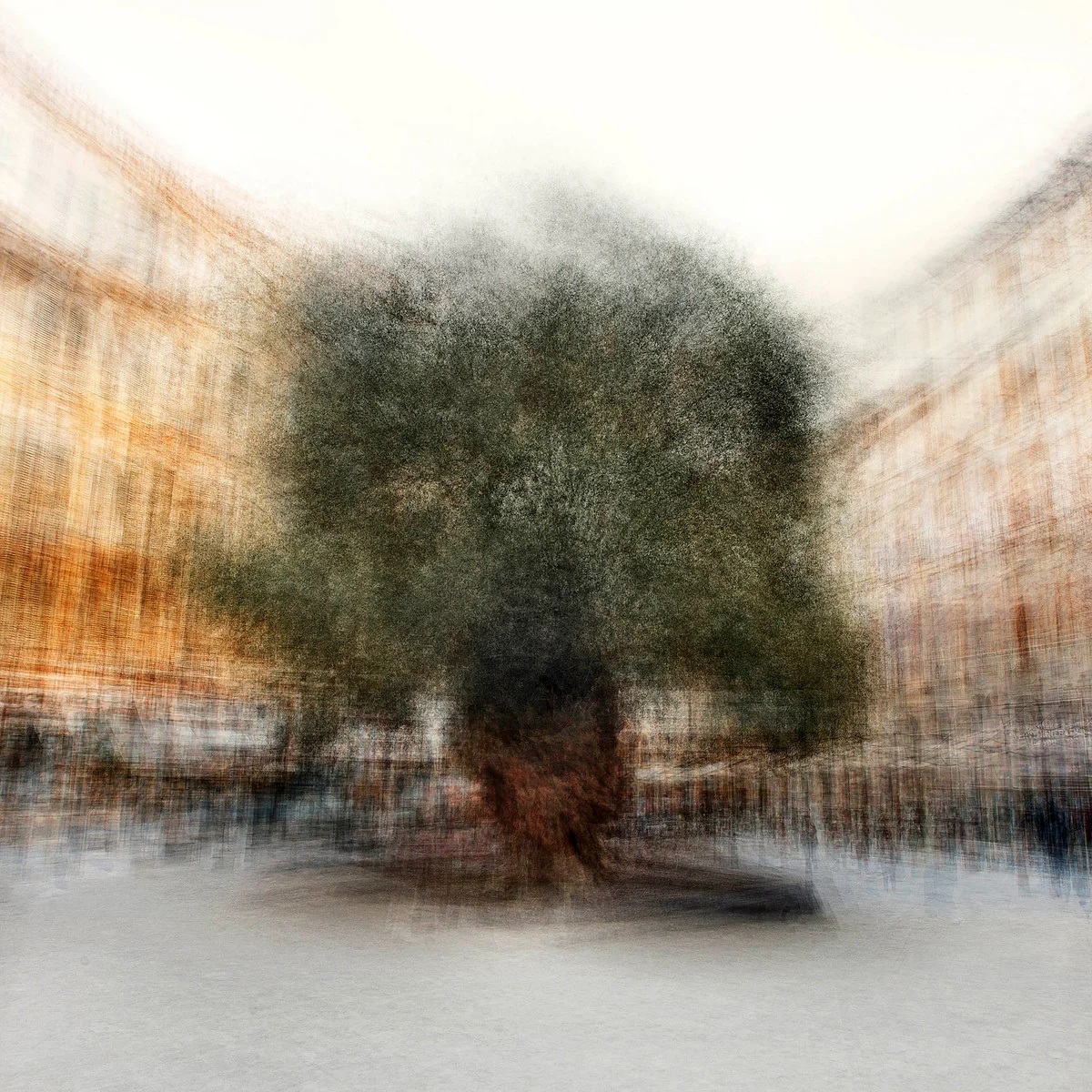 This contemporary fine art photograph by Jacob Gils depicts a solitary olive tree anchored within a historic Mediterranean plaza, rendered through layered motion and soft blur that dissolves surrounding architecture into a luminous haze, creating a poetic meditation on stillness, cultural memory, and the timeless presence of nature within the urban landscape.